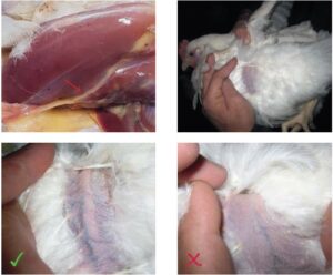 رگ چربی در لبه سینه، ذخایر چربی یک ماده را نشان میدهد (تصاویر بالا). این چربی به پرندگان شروع خوبی برای تولید میدهد، پس از هفته ۴۵ بهعنوان ذخیره عمل میکند و پرندگان در مواجهه با چالشها و استرس، مانند عفونت IB، مقاومتر هستند. در این صورت تولید کاهش نمییابد و پرنده سریعتر بهبود مییابد. یک رگ چربی برجسته (پایین چپ) نشانه خوبی است، در حالی که رگ چربی سمت راست تقریباً وجود ندارد.