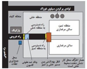 مزرعه به یک قسمت تمیز (سالنها) که پرندگان در آن نگهداری میشوند و یک قسمت کثیف با دسترسی به دنیای بیرون تقسیم می شود. مزارع باید کاملاً توسط یک حصار بسته احاطه شوند.