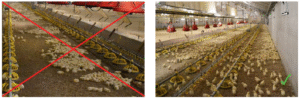 در تصویر راست، جوجهها به طور یکسان توزیع شدهاند. در تصویر چپ، جوجهها به صورت خوشهای و تعداد زیادی از آنها در انتهای سالن قرار دارند: آنها خیلی احساس سرما میکنند!
