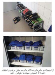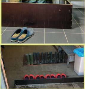 هنگامی که از کفش یا کاور چکمه برای هر مرغداری استفاده میشود، باید یک “مانع جداکننده قدم” در ورودی ایجاد شود. وقتی از این مانع عبور میکنید، یک جفت کفش، چکمه یا کاور چکمه جدید میپوشید و هنگام خروج از مرغداری برعکس عمل میکنید. در تصویر پایین، هنگام ورود از بیرون، قبل از پوشیدن چکمههای تمیز، دمپایی موقت پوشیده میشود و یک مرحله اضافی به پروسه افزوده میشود.