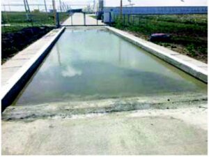مناسب است که یک حوضچه ضدعفونی در ورودی مرغداری وجود داشته باشد که کامیون باید از آن عبور کند تا چرخ‌ها را ضدعفونی کند. ورودی کامیون باری خارج کردن پرندگان تلف شده یک خطر بزرگ برای مرغداری است: این کامیون نباید از مانع بهداشتی عبور کند؛ پرندگان تلف شده (نگهداری‌شده در ظروف ویژه) باید خارج از حصار بارگیری شوند.