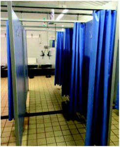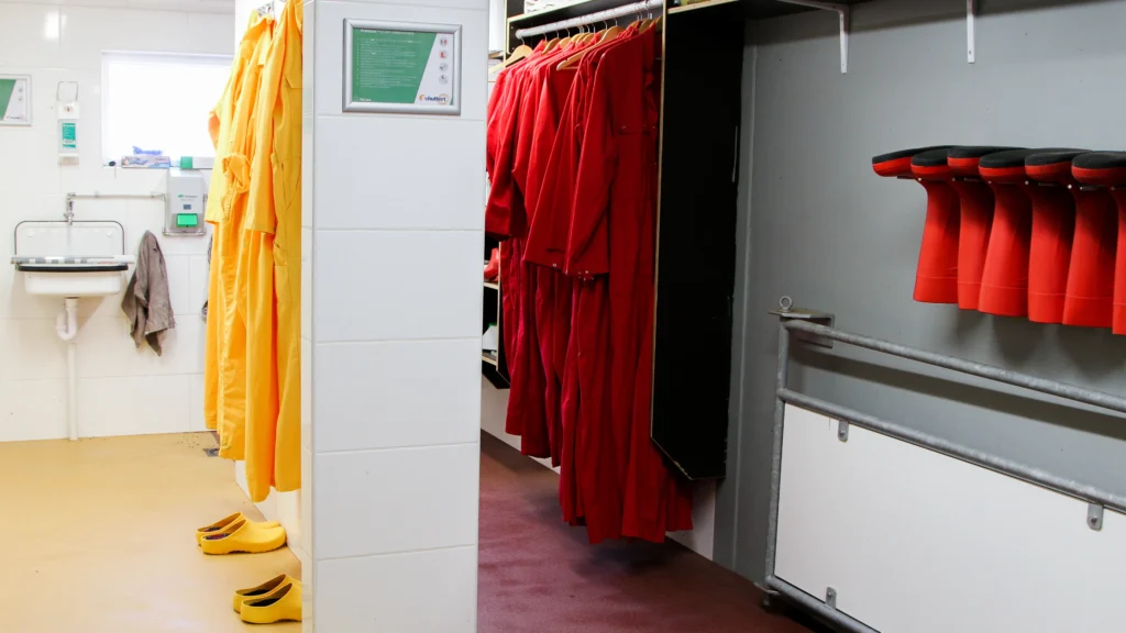 سیاست “دوش هنگام ورود – دوش هنگام خروج”: تمام لباس‌ها و وسایل شخصی باید در محل خارجی دوش گرفتن ذخیره شوند. پس از دوش گرفتن، هر فردی که وارد مرغداری می‌شود باید لباس‌های مخصوص مزرعه را بپوشد.