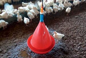 این آبخوری زنگوله‌ای به درستی تنظیم نشده است و باعث مرطوب شدن بستر می‌شود. اطمینان حاصل کنید که آب حداقل تا دو ساعت پس از خوراک‌دهی در دسترس باشد تا هیچ نزاعی برای خوردن آب رخ ندهد و منجر به ریختن آب نشود.
