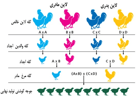 پرورشدهندگان خبره، با درک عمیق از این تفاوتهای ژنتیکی، لاینهای مادری و پدری را بهگونهای انتخاب میکنند که مکمل یکدیگر باشند. هدف غایی، دستیابی به حداکثر کارایی هم در زمینه تولید جوجههای سالم و کافی (توسط لاین مادر) و هم در زمینه تولید مرغ گوشتی با عملکرد برتر (با تأثیر ژنهای لاین پدر) است. این والدین، که در واقع اجداد خالص این زنجیره محسوب میشوند، در مراکز تخصصی پرورش یافته و تکثیر میشوند.