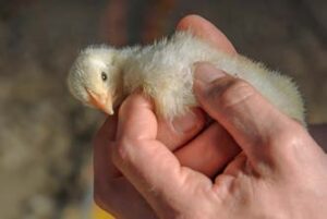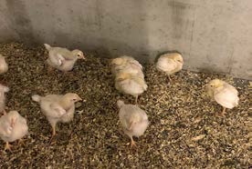 چهار جوجهی یکهفتهای که عقب ماندهاند؛ آنها هنوز کرک زرد دارند، جمع شدهاند و کمتر از همگلههای خود توسعه یافتهاند و در کنار دیوار مینشینند، دور از بقیهی گله. آنها احتمالاً از مشکلات روده رنج میبرند.